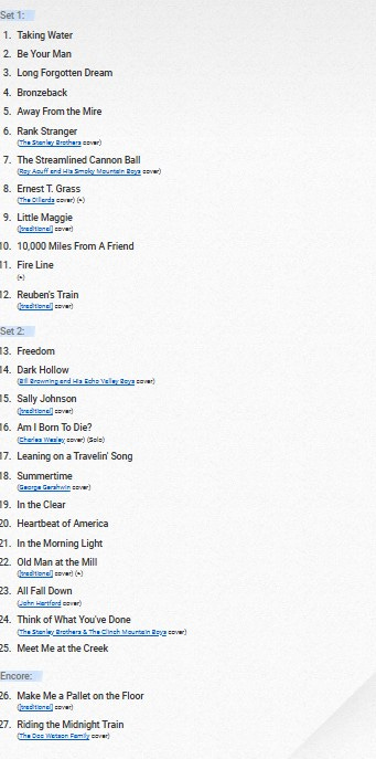 Billy Strings carries on the bluegrass tradition. The band is composed of the usual bluegrass quintet lineup, featuring fiddle, banjo, bass, mandolin, and guitar. There are bluegrass covers from The Stanley Brothers and Doc Watson.