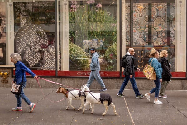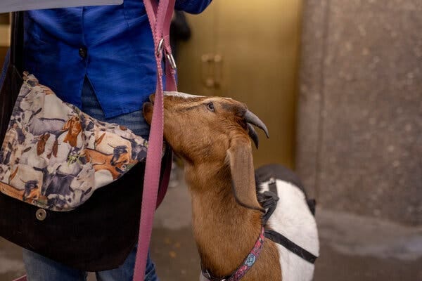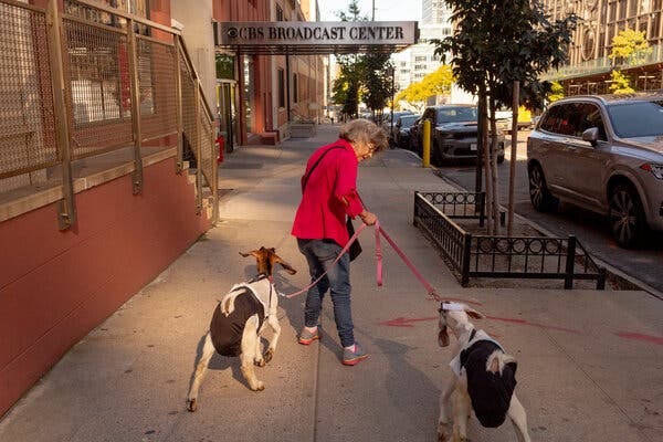The short, slender woman clutches two leashes in her right hand. At their ends are two goats, Marshmallow and Brownie. The three of them stand in the human jet stream of Rockefeller Center, and people stop to take pictures or pet the animals.