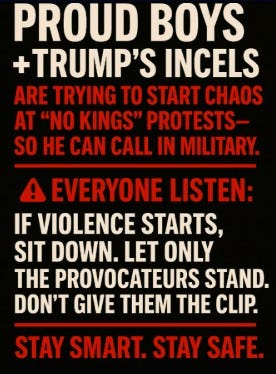 If you are going out in America, or anywhere in the world, for No Kings Day on October 18th, please be careful. Be Kind. Be Intelligent.