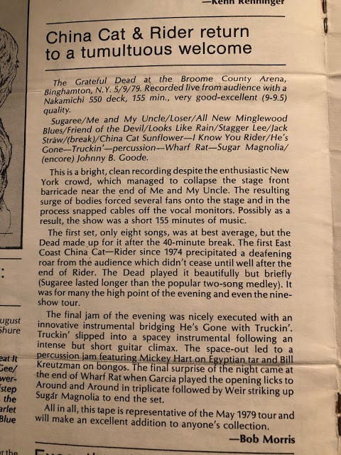 I did not know at the time, but China Cat Sunflower>I Know You Rider had not been played East of the Mississippi in 5 years….until tonight. I had no idea why the place had erupted in a true fever of Dead Head happiness until years later.